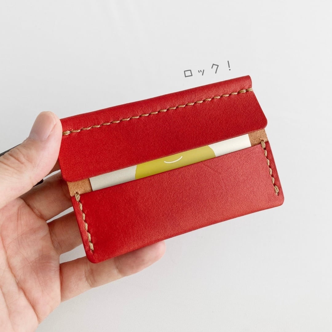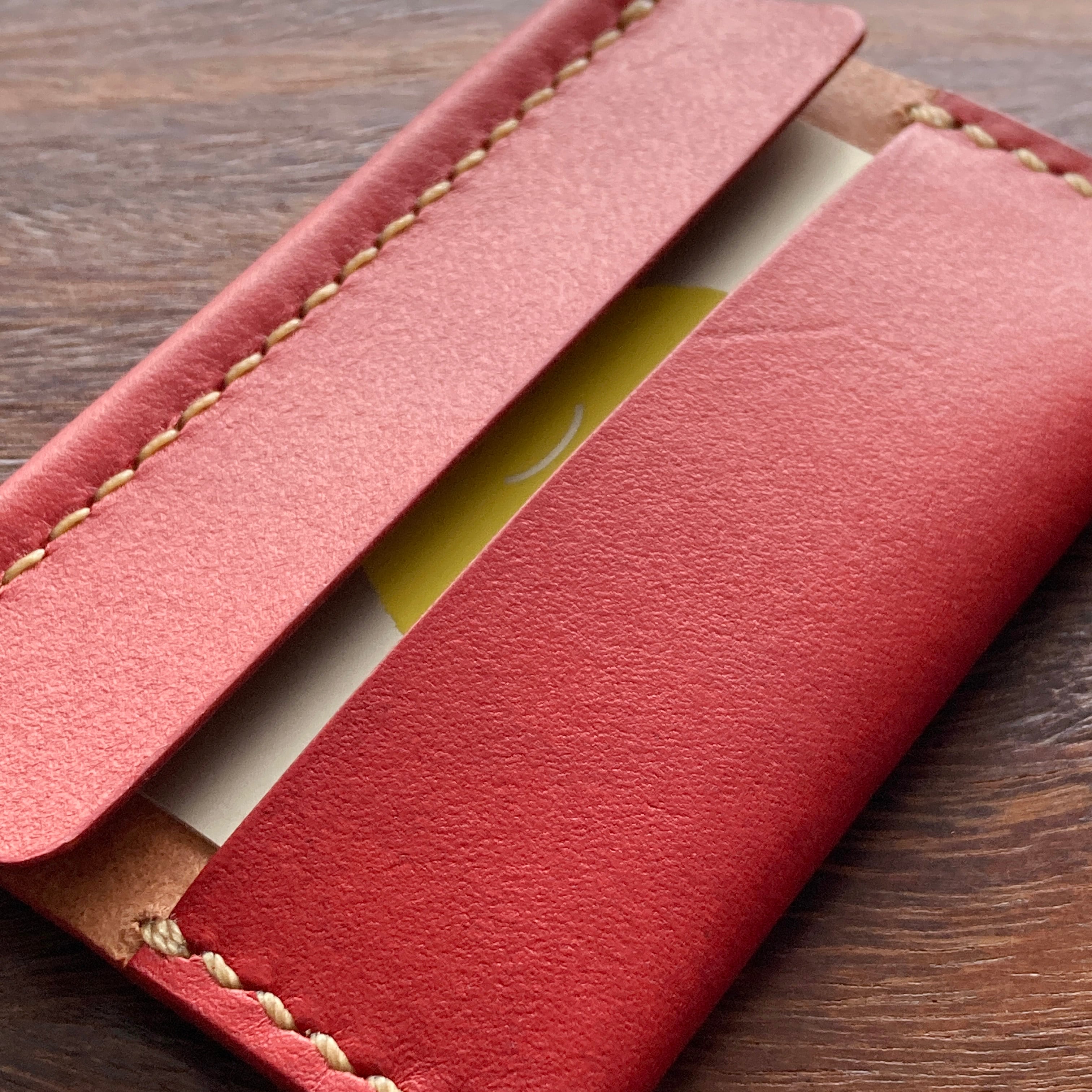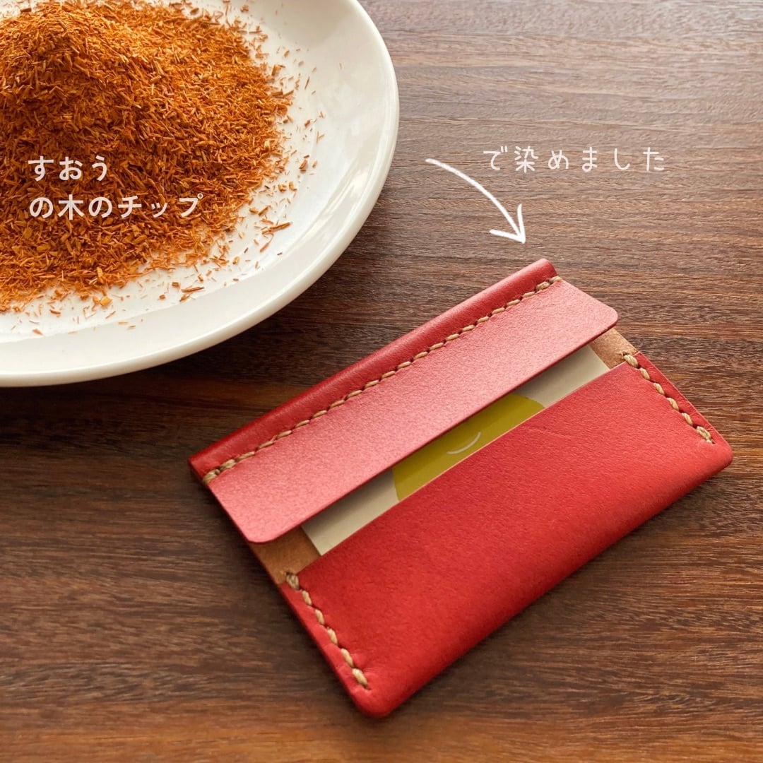 革 レザー 手縫い 手作り ハンドメイド 日本 職人 作家 レザークラフト ハンドクラフト 手仕事 革細工 革小物 ギフト プレゼント 誕生日 記念日 クリスマス 新年 バレンタインデー ホワイトデー 新生活 シンプル ミニマム ナチュラル 軽い 金具なし カードケース キャッシュレス クレジットカード ICカード 定期 仕切り 薄い 草木染め 植物染め 天然染料 すおう染め 赤 和の色 ナチュラルカラー