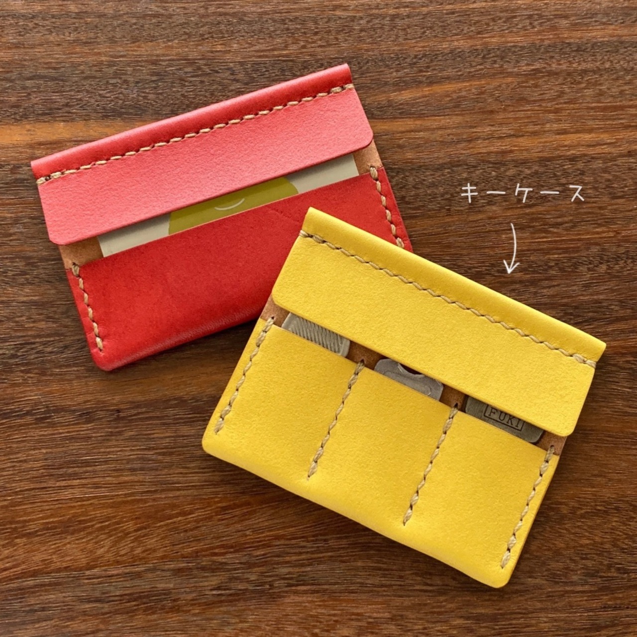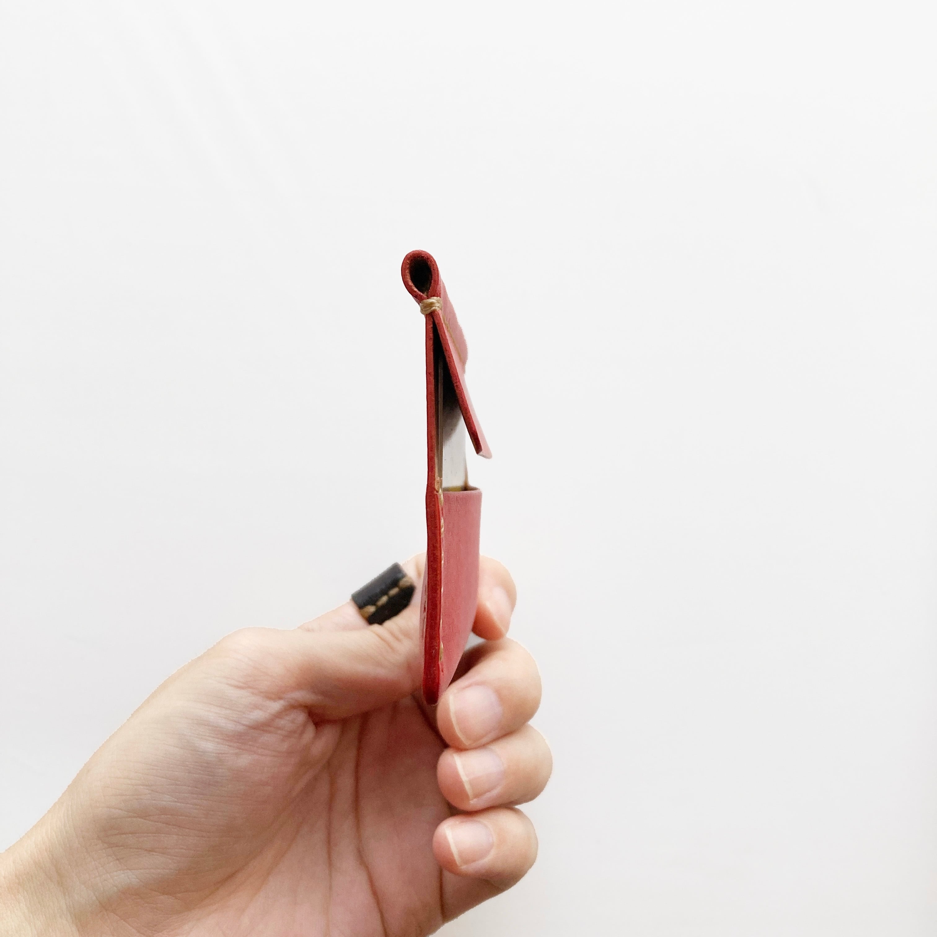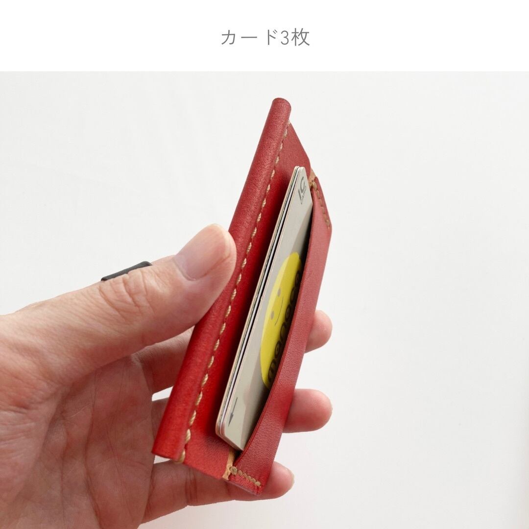 革 レザー 手縫い 手作り ハンドメイド 日本 職人 作家 レザークラフト ハンドクラフト 手仕事 革細工 革小物 ギフト プレゼント 誕生日 記念日 クリスマス 新年 バレンタインデー ホワイトデー 新生活 シンプル ミニマム ナチュラル 軽い 金具なし カードケース キャッシュレス クレジットカード ICカード 定期 仕切り 薄い 草木染め 植物染め 天然染料 すおう染め 赤 和の色 ナチュラルカラー