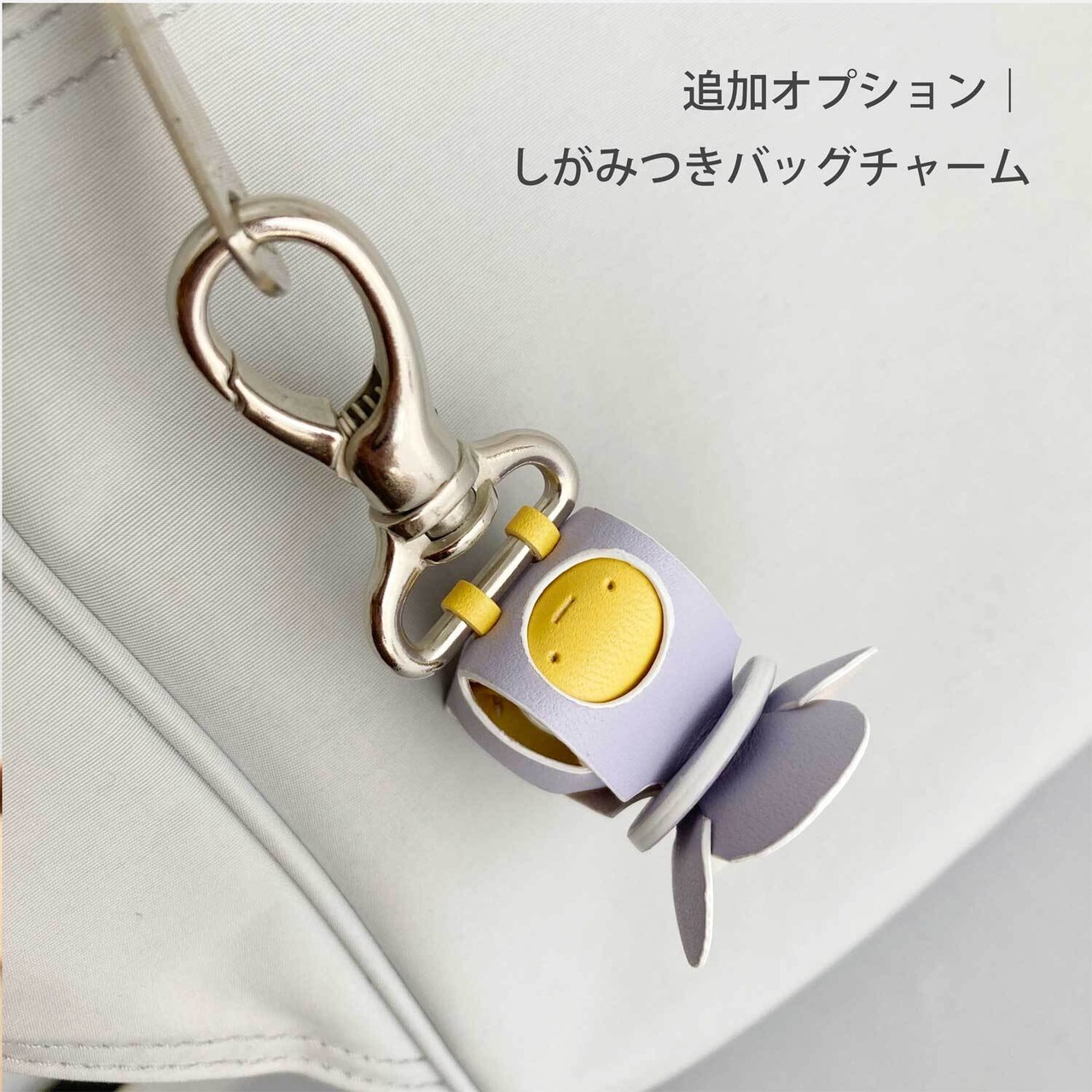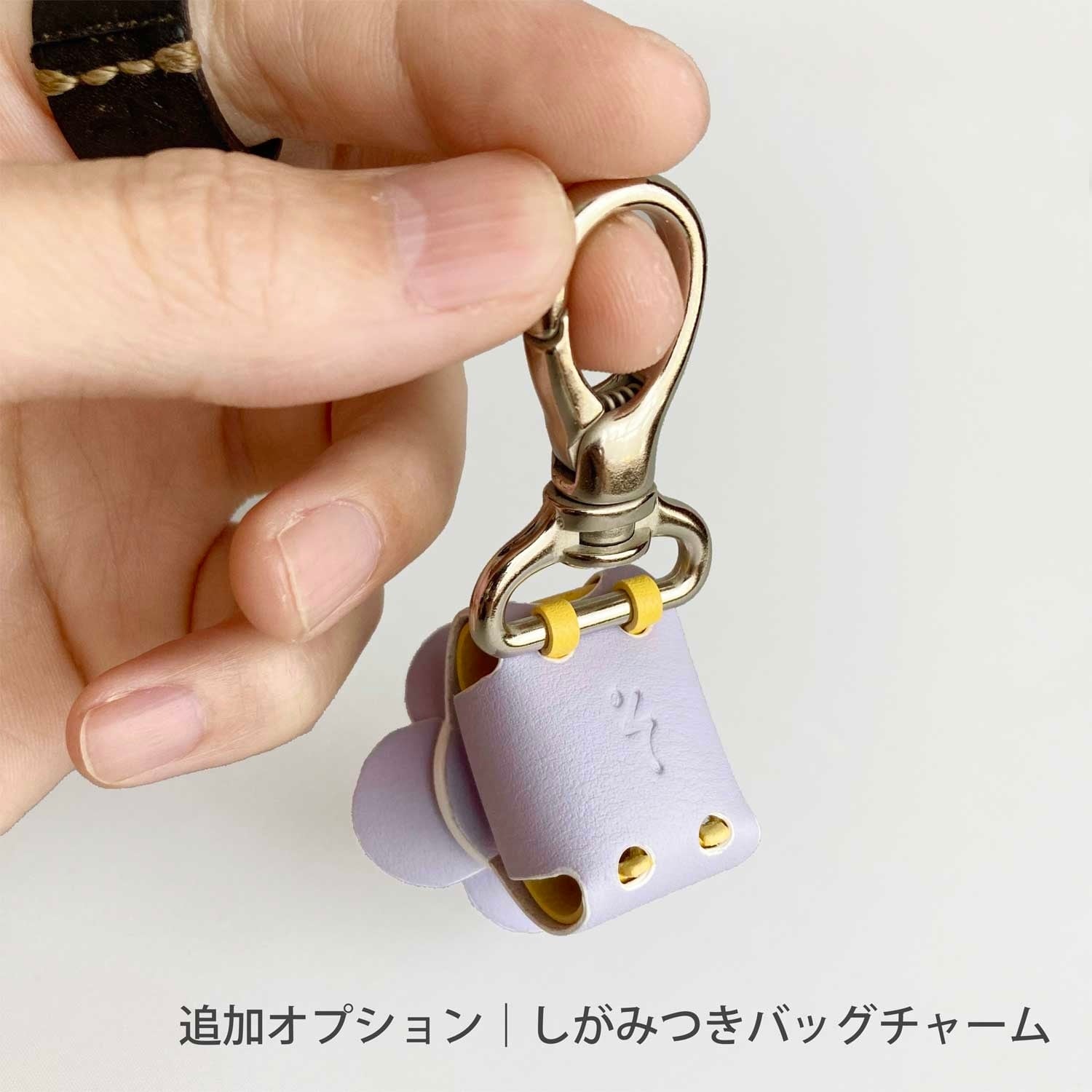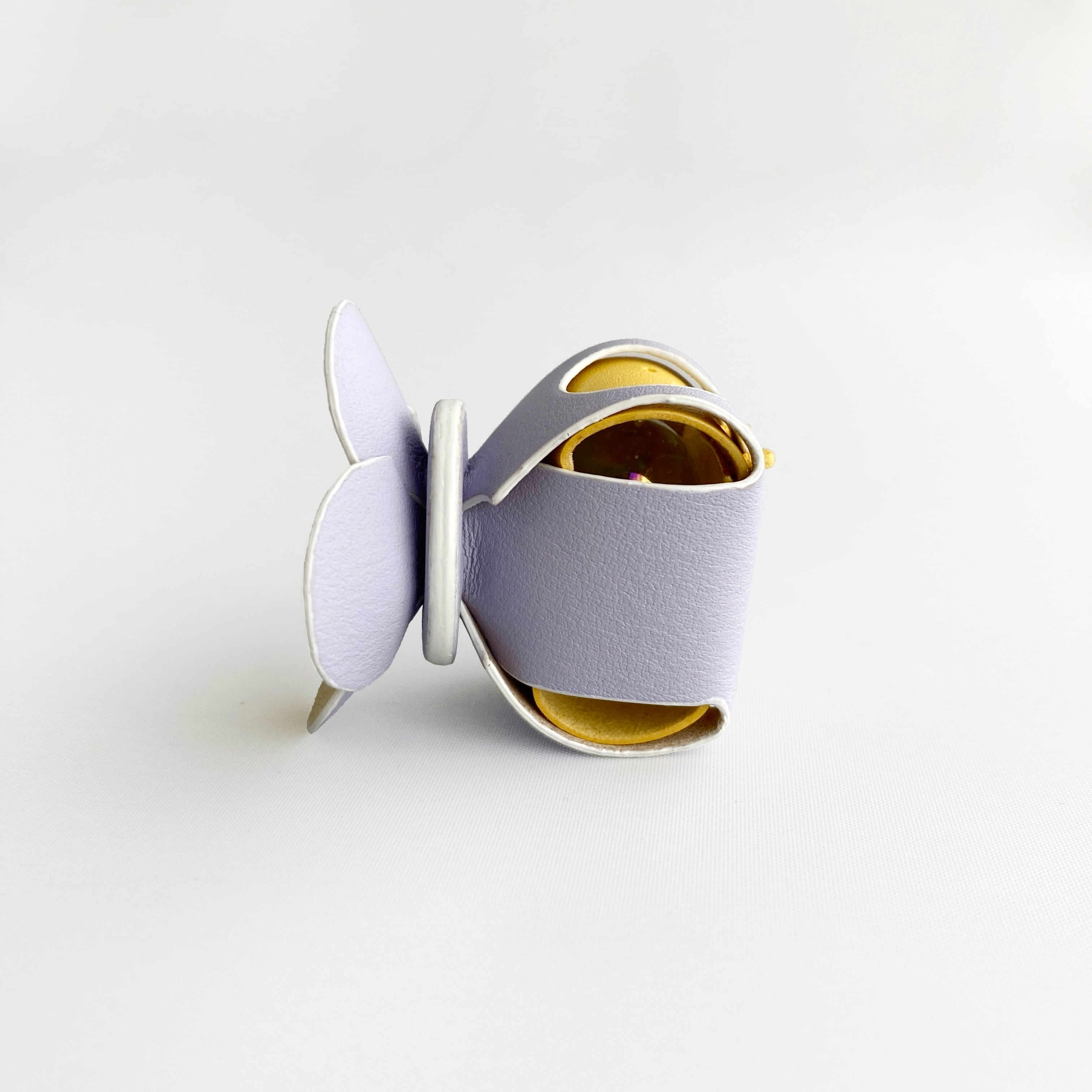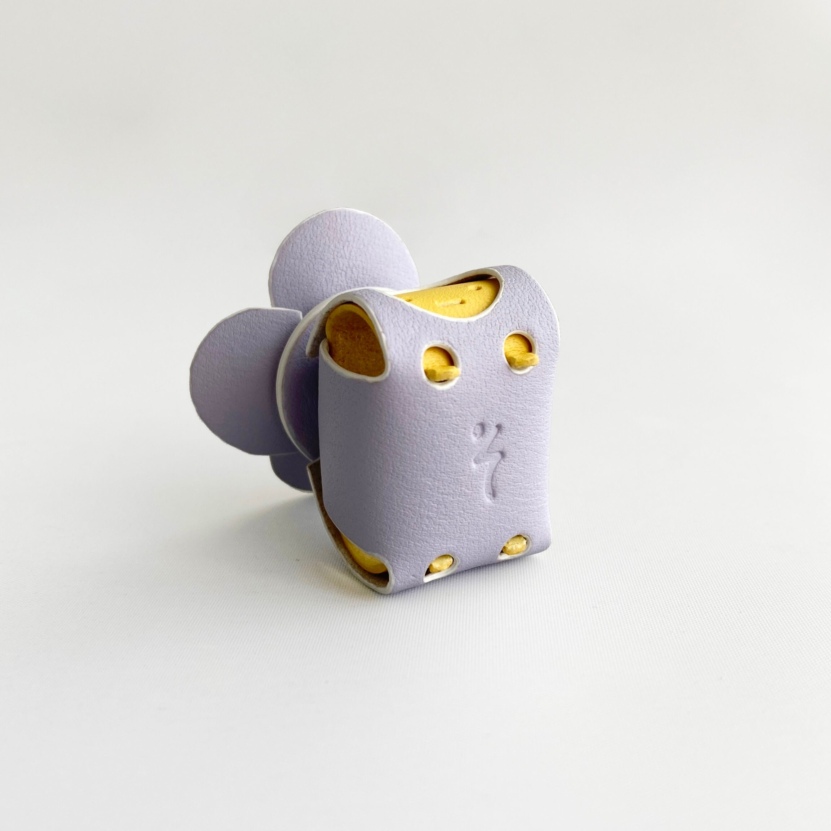 タンニンなめしのヌメ革をパープルとイエローに染めあげ、ホワイトの縁取りを添えて仕上げました。