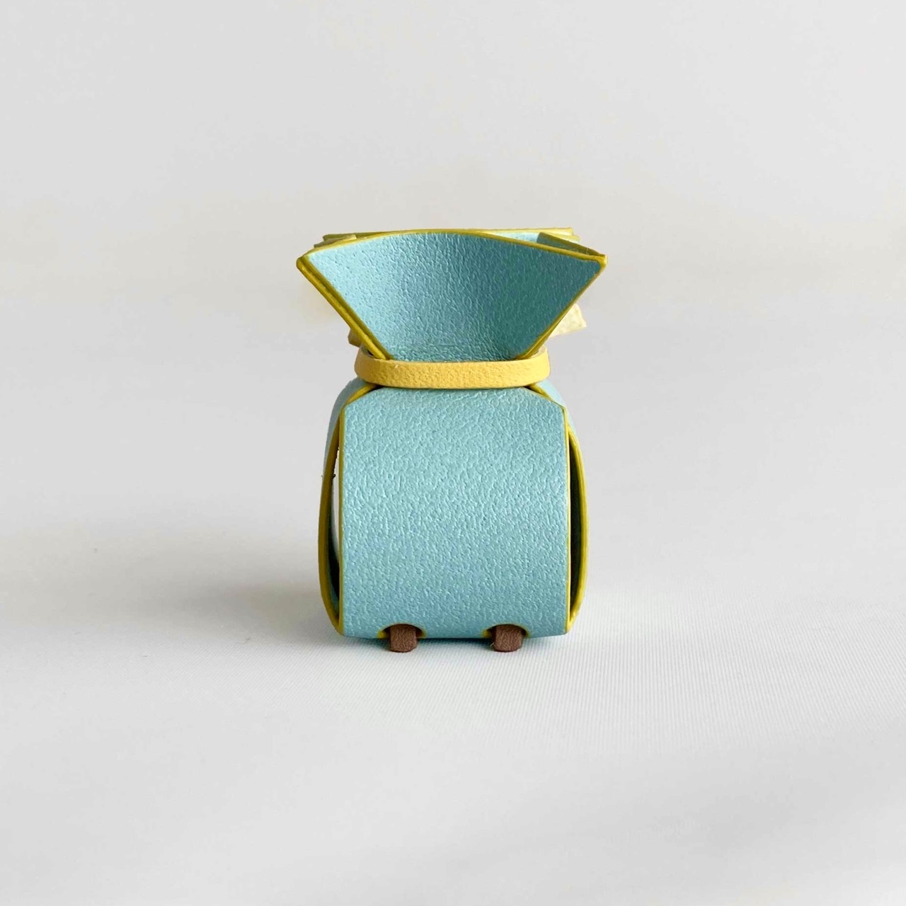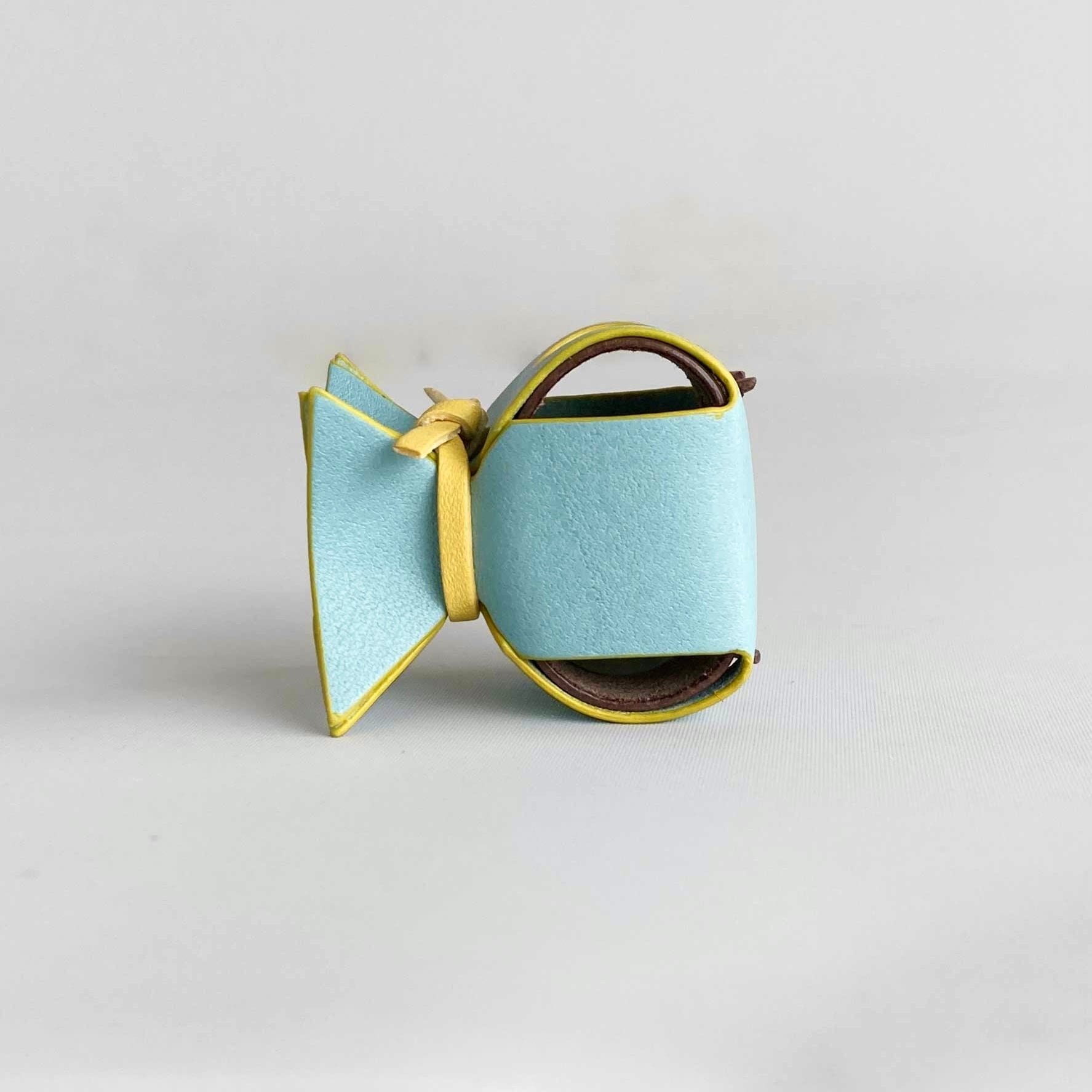 タンニンなめしのヌメ革をパステルブルーとブラウンに染めあげ、黄色の縁取りを添えて仕上げました。
