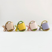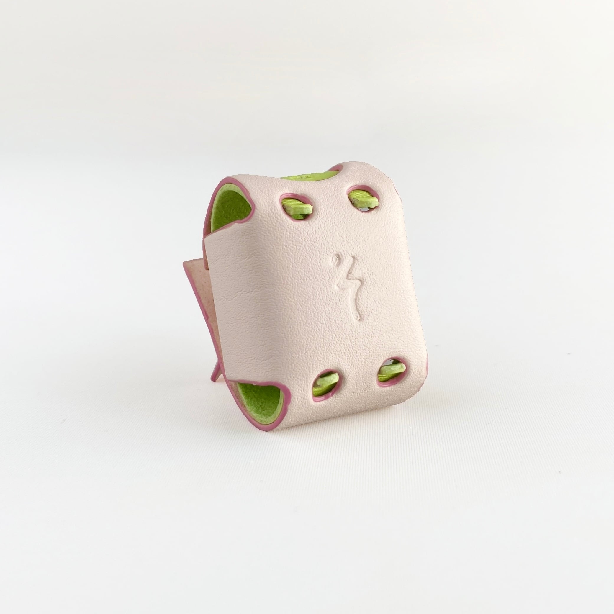タンニンなめしのヌメ革を染めあげ、カラフルな縁取りを添えて仕上げました。