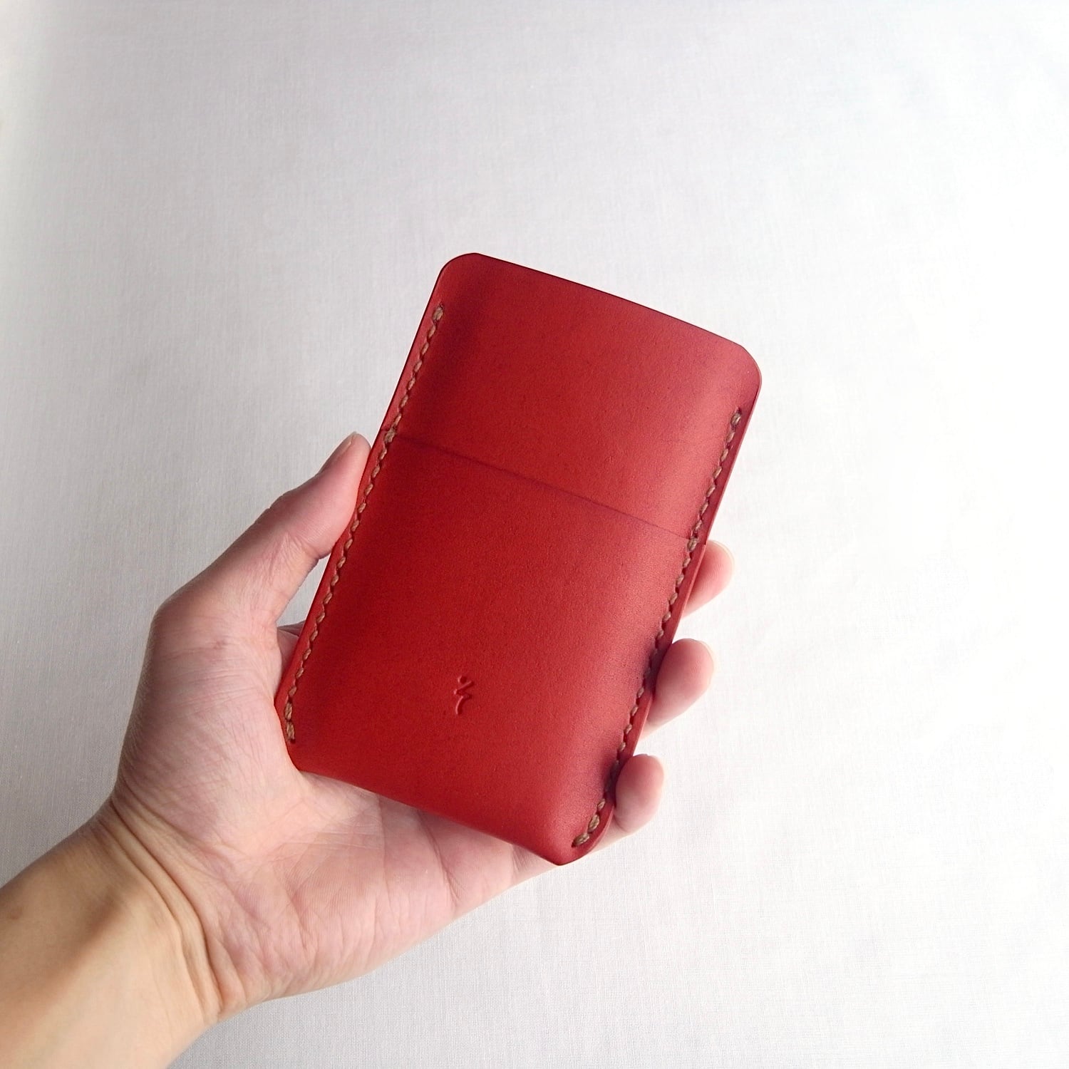革 レザー 草木染め 手縫い 手染め 手作り ハンドメイド 日本 職人 作家 レザークラフト ハンドクラフト 手仕事 革細工 革小物 ギフト プレゼント 誕生日 記念日 クリスマス 新年 バレンタインデー ホワイトデー 新生活 シンプル ミニマム ナチュラル 軽い 金具なし 刻印可 スマホケース スマホ そのまま入れる ケースのまま入れる 赤色 レッド 女性 レディース
